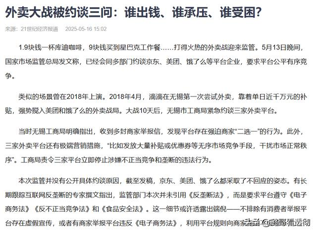 这次外卖大战有几个特点,首先是5月,市场监管总局约谈了三大平台,要求平台公平有序竞争。