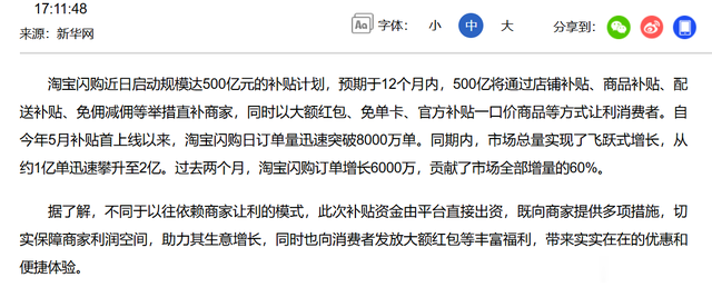 第二点,就是人民日报发文,说淘宝闪购500亿补贴是打破行业内卷、激发新消费的有效尝试。